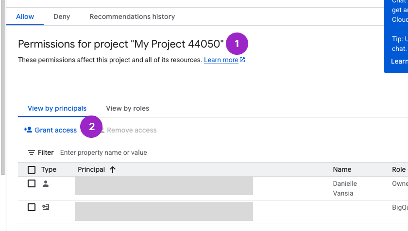 - In the center of the page, under Permissions for project “My Project ABCD”, click + Grant access.