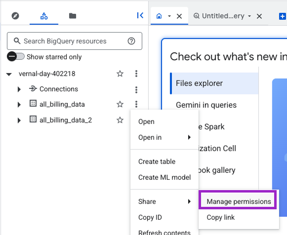 Go back to BigQuery, and complete the steps below to grant the Vantage service account permission to access the BigQuery dataset.1